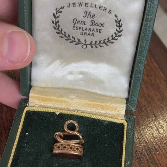 Antique French “Beware!” Or “Take Care!” Prevez Garde yellow gold snake and rope seal with mouse and trap. Seal is made with hessonite garnet.