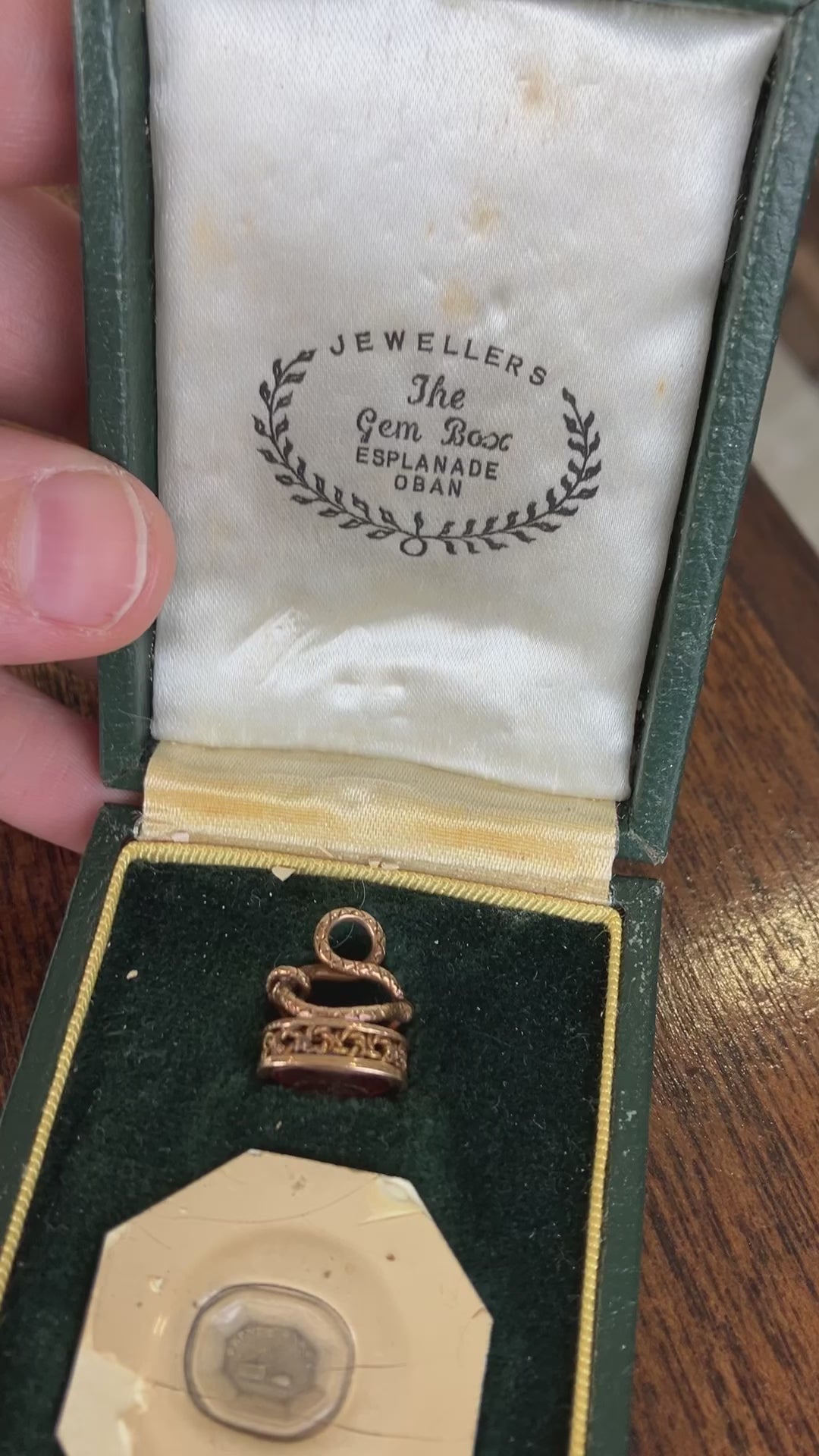 In original box 5/8 inches wall, 1/2 inch wide seal. Seal tests as 16K solid gold.