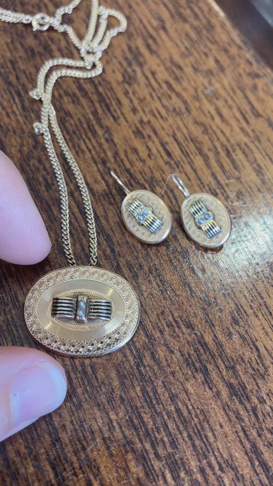 Necklace: 1x3/4 inch oval pendant. 16 inch gold filled chain terminated by a spring ring clasp.