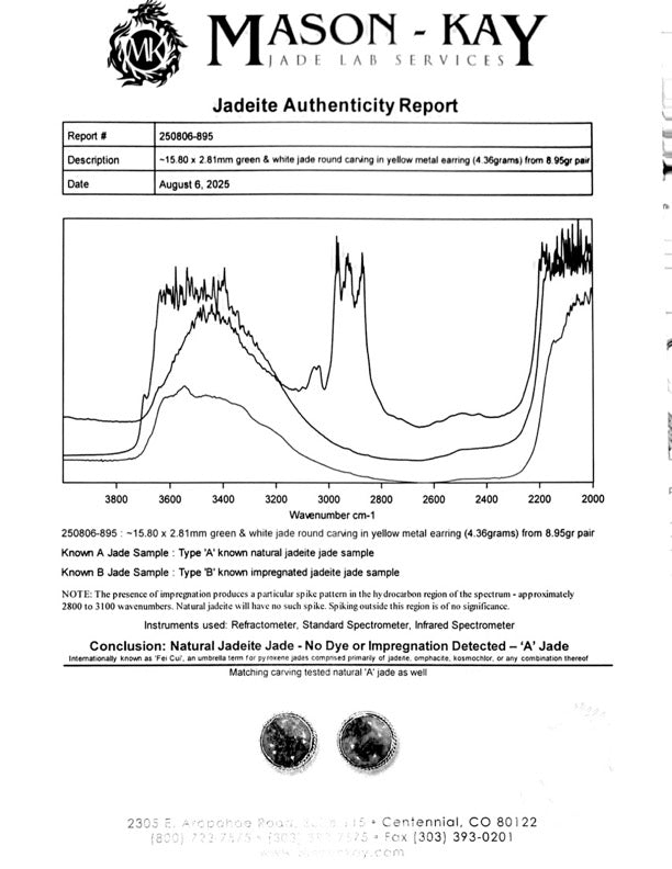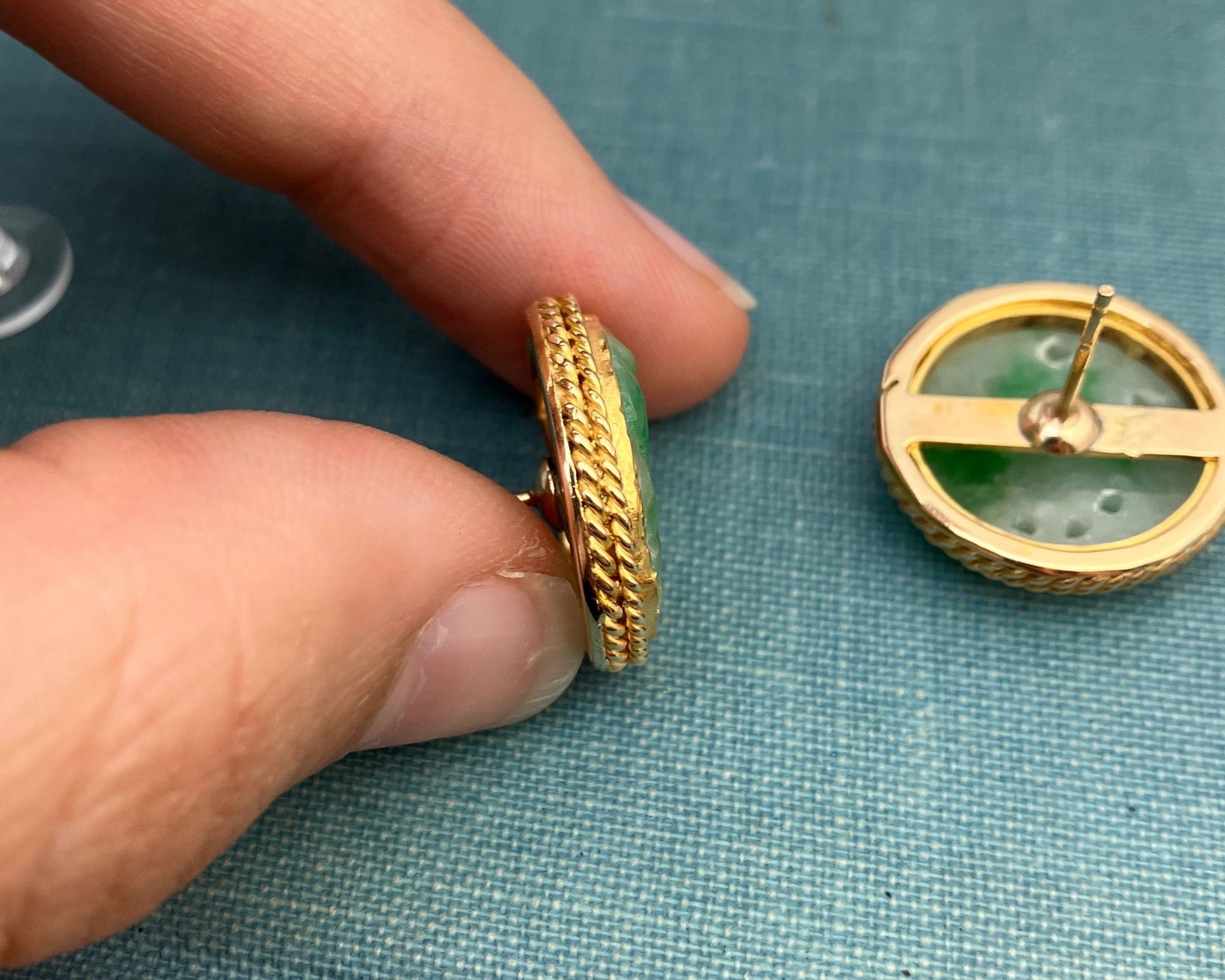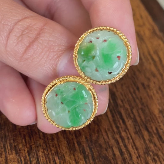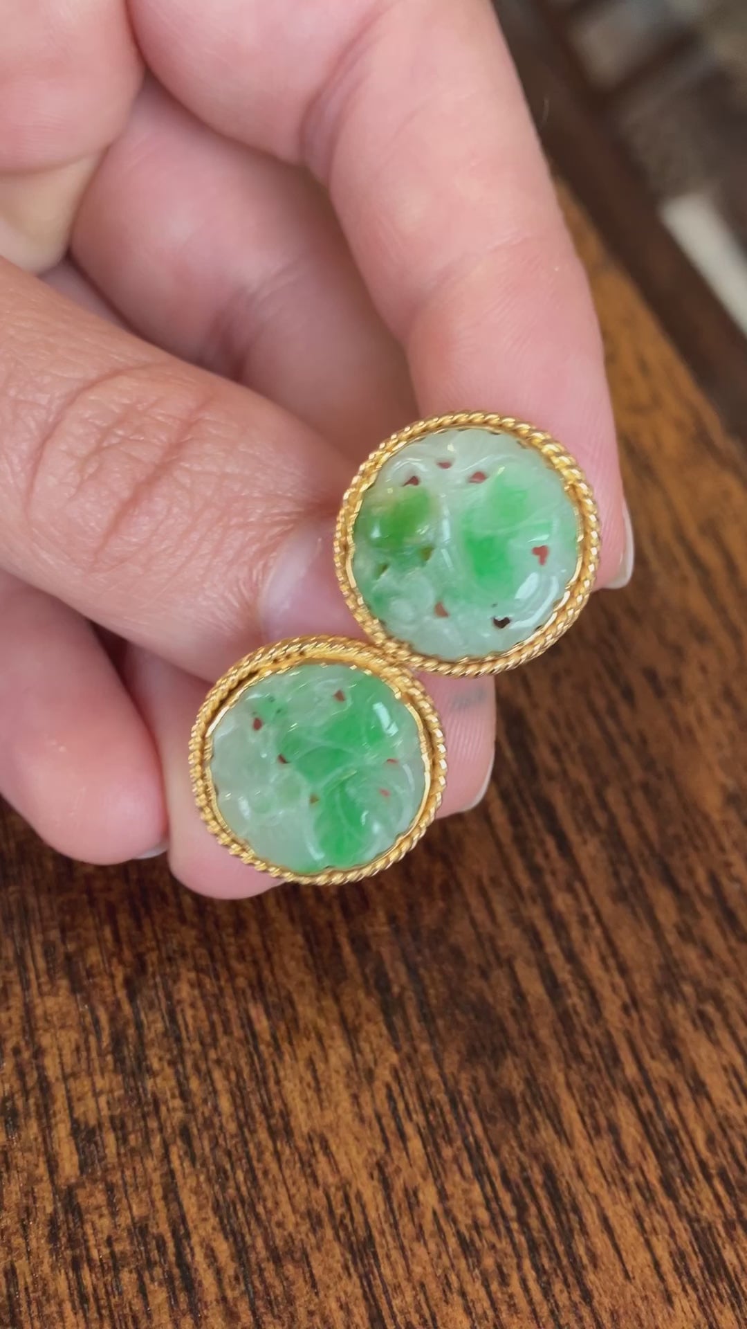 Carved vintage Jadeite earrings with gold accents. Earrings are almost 3/4 inches round with twist accent.