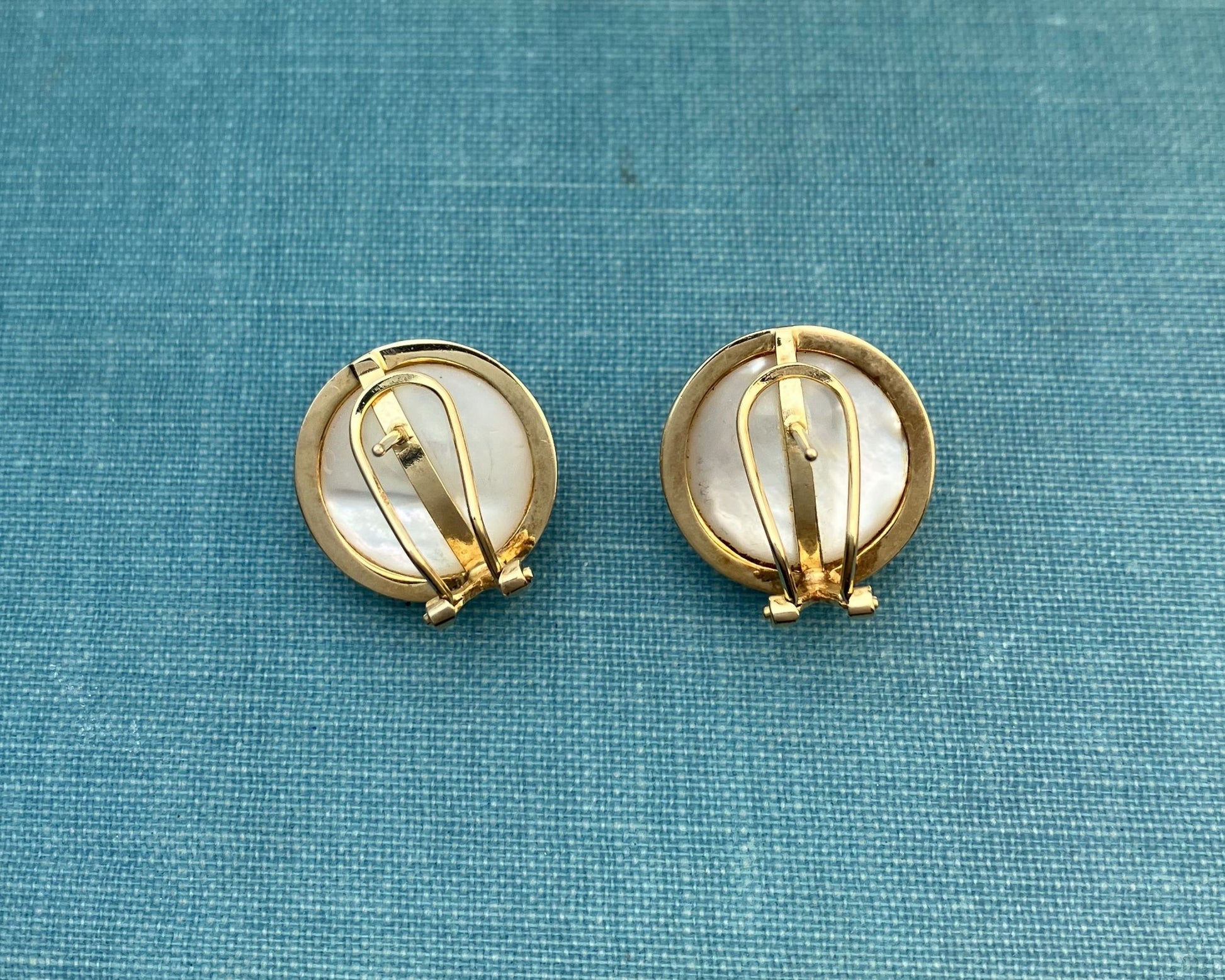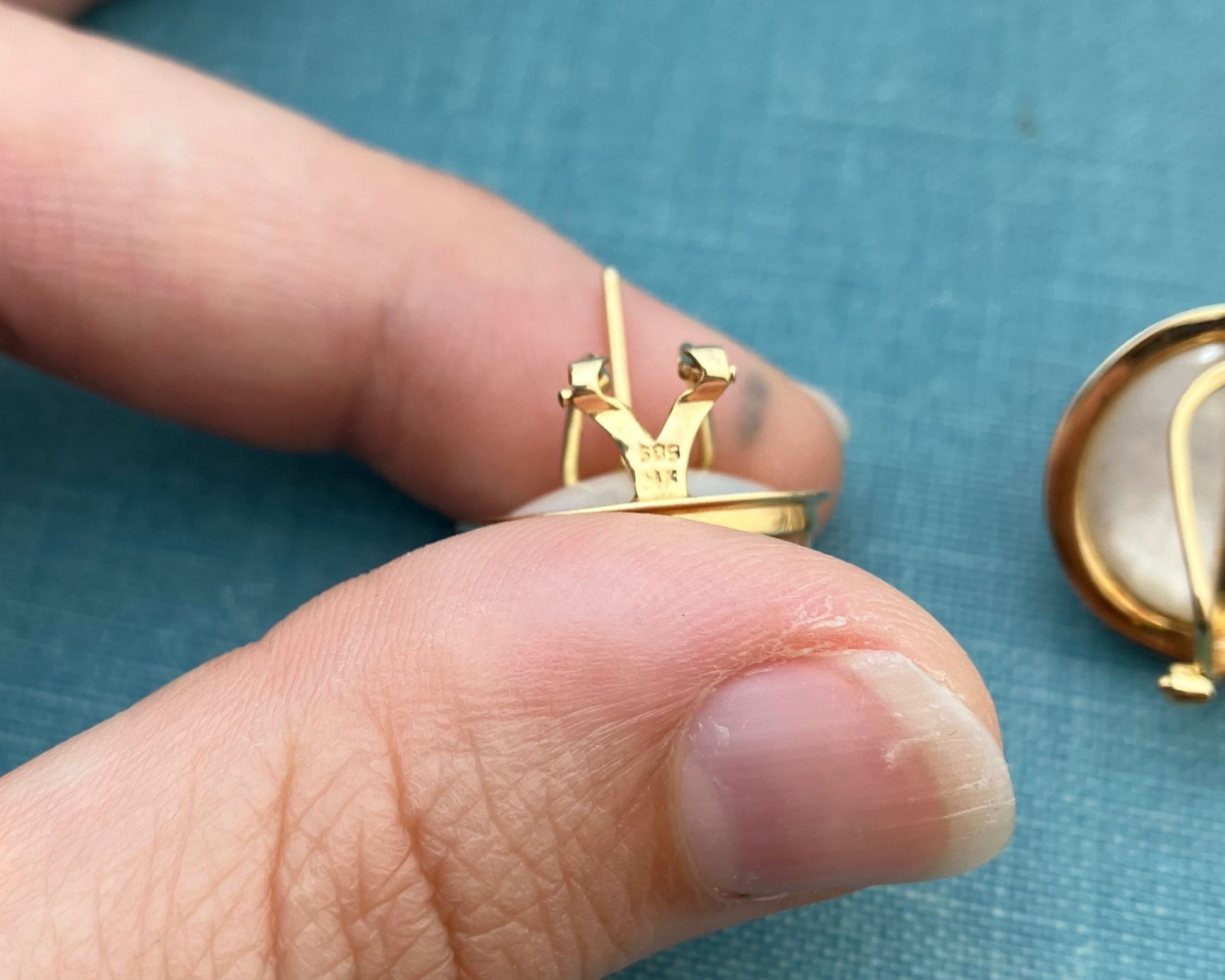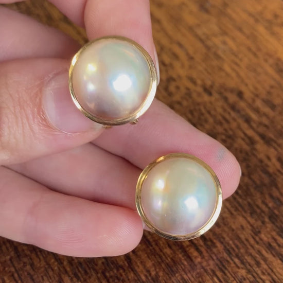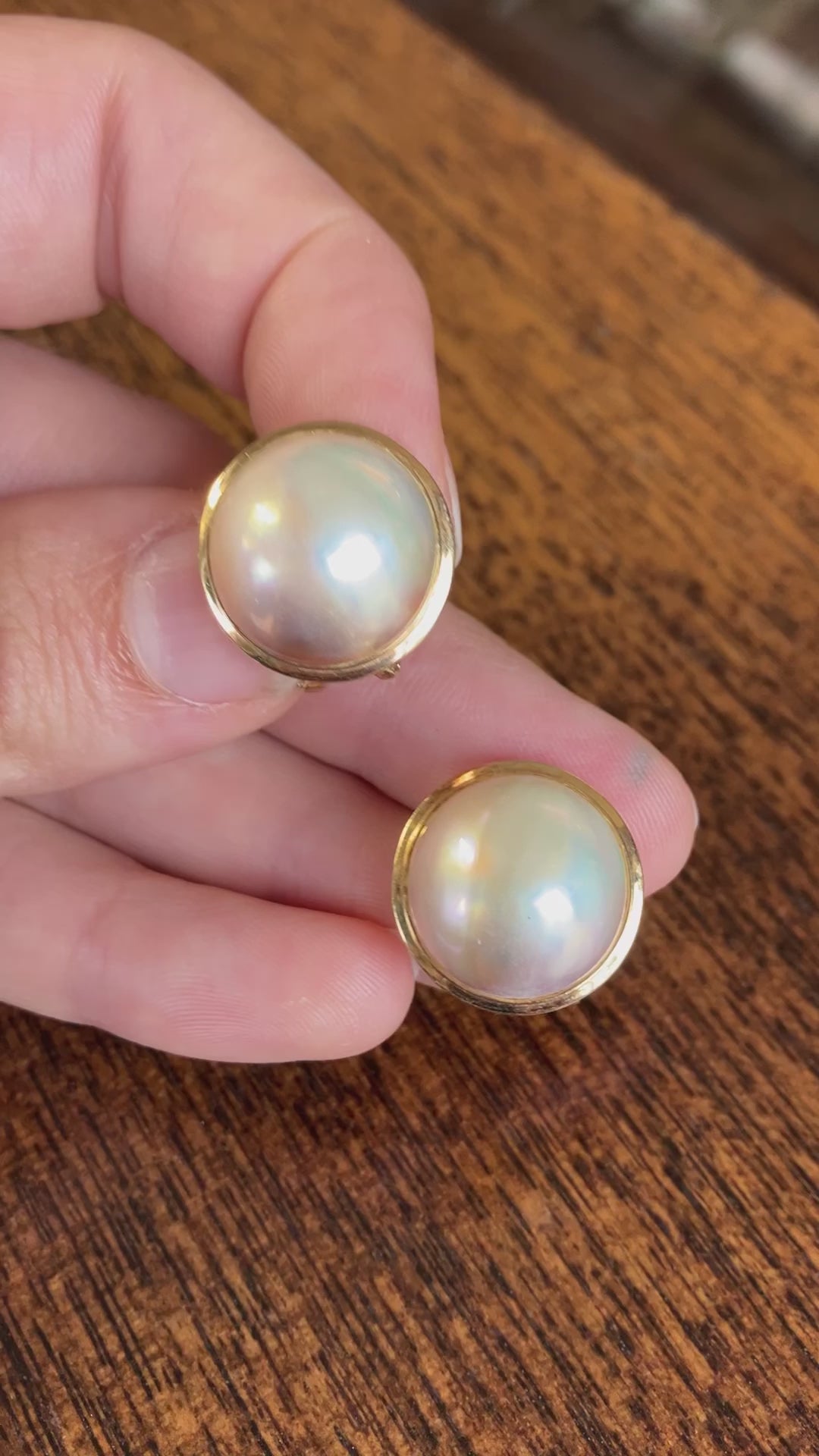 Vintage mabe pearl 14k yellow gold post earrings with omega back clips. Excellent condition.
