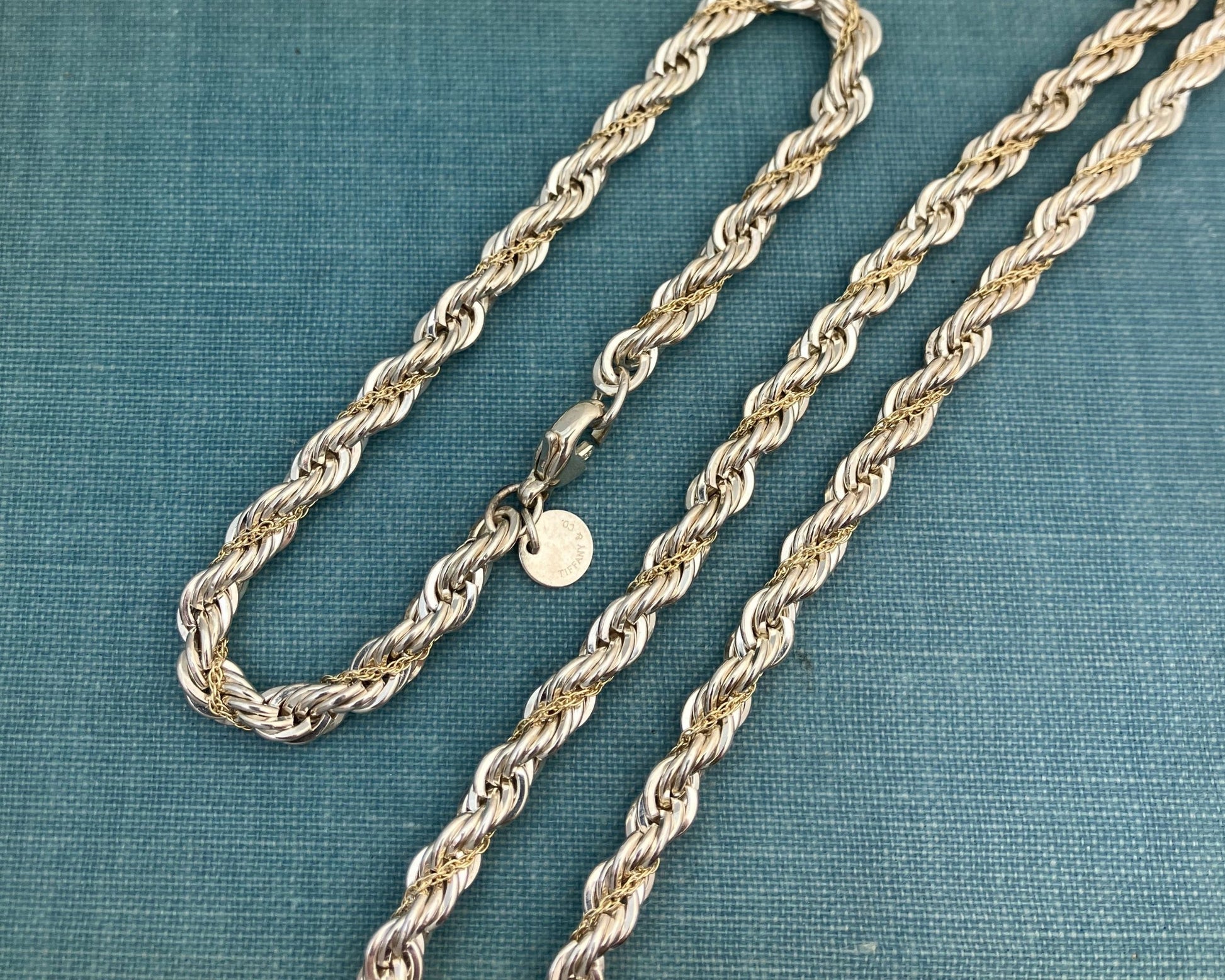 Tiffany and Co rope necklace and bracelet set circa 1990's-2000's. Necklace is 24 inches long. Bracelet is 7.5 inches long. Both are terminated by a lobster claw clasp and has Tiffany and Co disc tag.