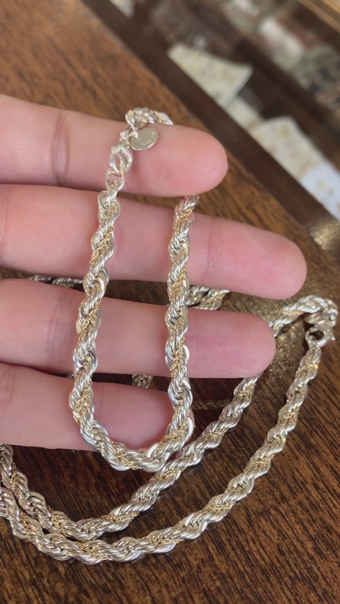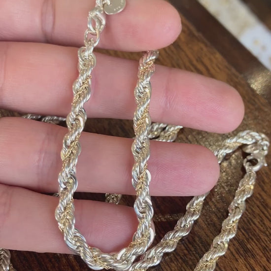 Double twist 5mm wide rope necklace has a sterling silver base and 18k yellow gold accent.