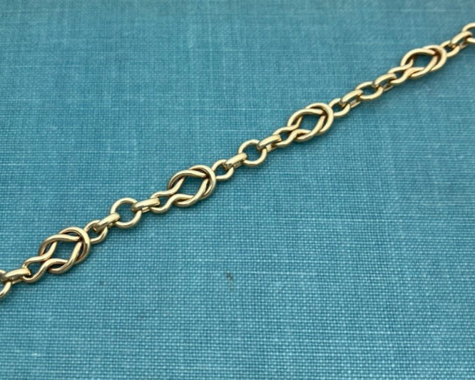 Vintage square knot bracelet in 14k yellow gold with spring ring clasp. Clasp is tight.